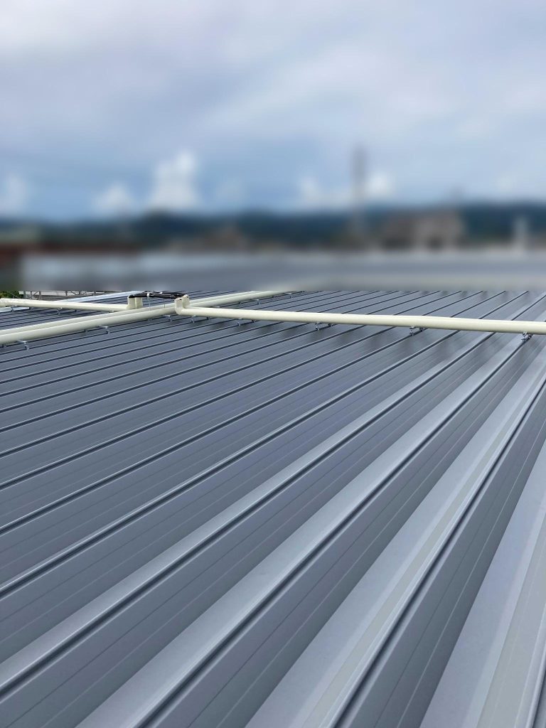 屋根材には、**ヨドコウ製「ヨド166ルーフハゼ」**を採用。現場成形にて対応し、長尺対応や施工性に優れた仕上がりを実現しています。